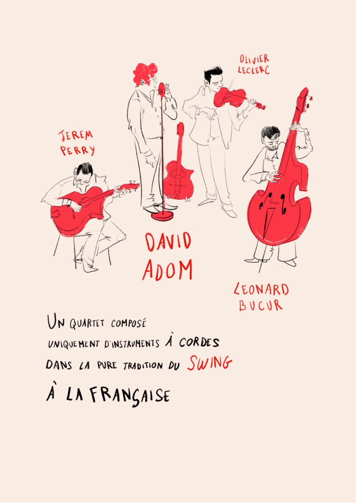 David Adom et son quartet à cordes, dans le droit fil du swing à la française, entend renouer avec un jazz joyeux et populaire dont la musique manouche est le meilleur exemple.