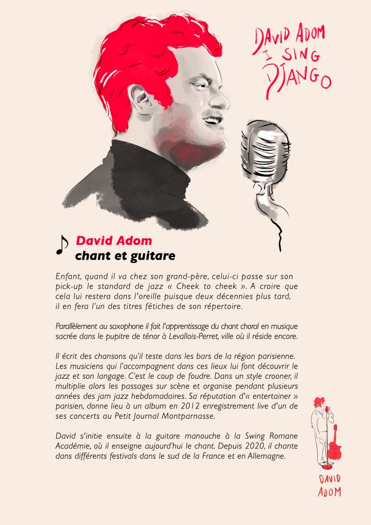 Enfant, quand il va chez son grand-père, celui-ci passe sur sonpick-up le standard de jazz « Cheek to cheek ». A croire que cela lui restera dans l’oreille puisque deux décennies plus tard, il en fera l’un des titres fétiches de son répertoire. Parallèlement au saxophone il fait l’apprentissage du chant choral en musique sacrée dans le pupitre de ténor à Levallois-Perret, ville où il réside encore. Il écrit des chansons qu’il teste dans les bars de la région parisienne. Les musiciens qui l’accompagnent dans ces lieux lui font découvrir le jazz et son langage. C’est le coup de foudre. Dans un style crooner, il multiplie alors les passages sur scène et organise pendant plusieurs années des jam jazz hebdomadaires. Sa réputation d’« entertainer » parisien, donne lieu à un album en 2012 enregistrement live d’un de ses concerts au Petit Journal Montparnasse. En 2017 David s’initie à la guitare manouche à la Swing Romane Académie, où il enseigne ensuite le chant. Depuis 2020, il chante dans différents festivals en France et à l’étranger.