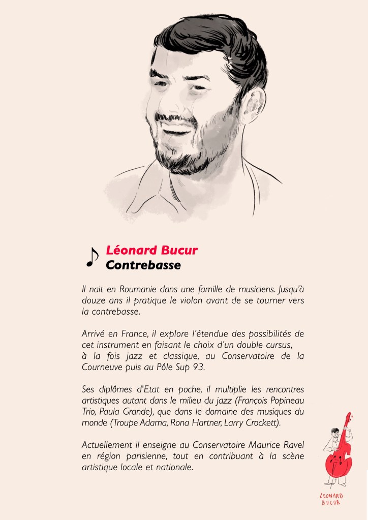 Il nait en Roumanie dans une famille de musiciens. Jusqu’à douze ans il pratique le violon avant de se tourner vers la contrebasse. Arrivé en France, il explore l’étendue des possibilités de cet instrument en faisant le choix d’un double cursus, à la fois jazz et classique, au Conservatoire de la Courneuve puis au Pôle Sup 9. Ses diplômes d’Etat en poche, il multiplie les rencontres artistiques autant dans le milieu du jazz (François Popineau Trio, Paula Grande), que dans le domaine des musiques du monde (Troupe Adama, Rona Hartner, Larry Crockett). Actuellement il enseigne au Conservatoire Maurice Ravel en région parisienne, tout en contribuant à la scène artistique locale et nationale.